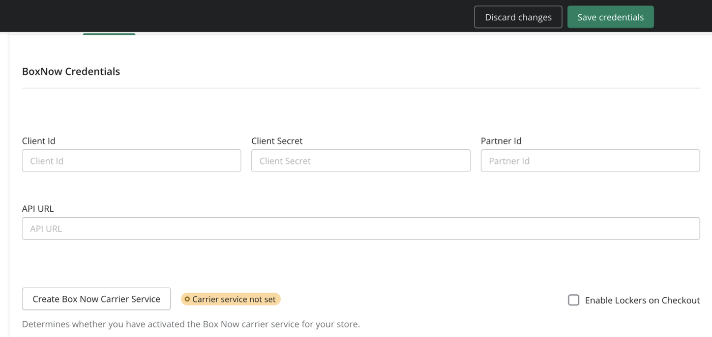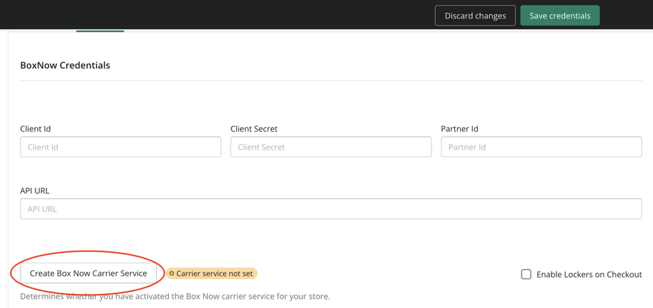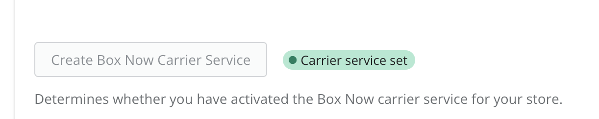 Κατόπιν, πρέπει να δημιουργηθεί η υπηρεσία της εφαρμογής η οποία θα είναι υπεύθυνη ώστε να στέλνει δυναμικά τα κοντινότερα Box Now lockers στο Checkout του πελάτη. Για να γίνει αυτό, ο merchant πρέπει να μπει στην εφαρμογή, να πατήσει στην καρτέλα Settings και τέλος να πατήσει το κουμπί "Create Box Now Carrier Service":
