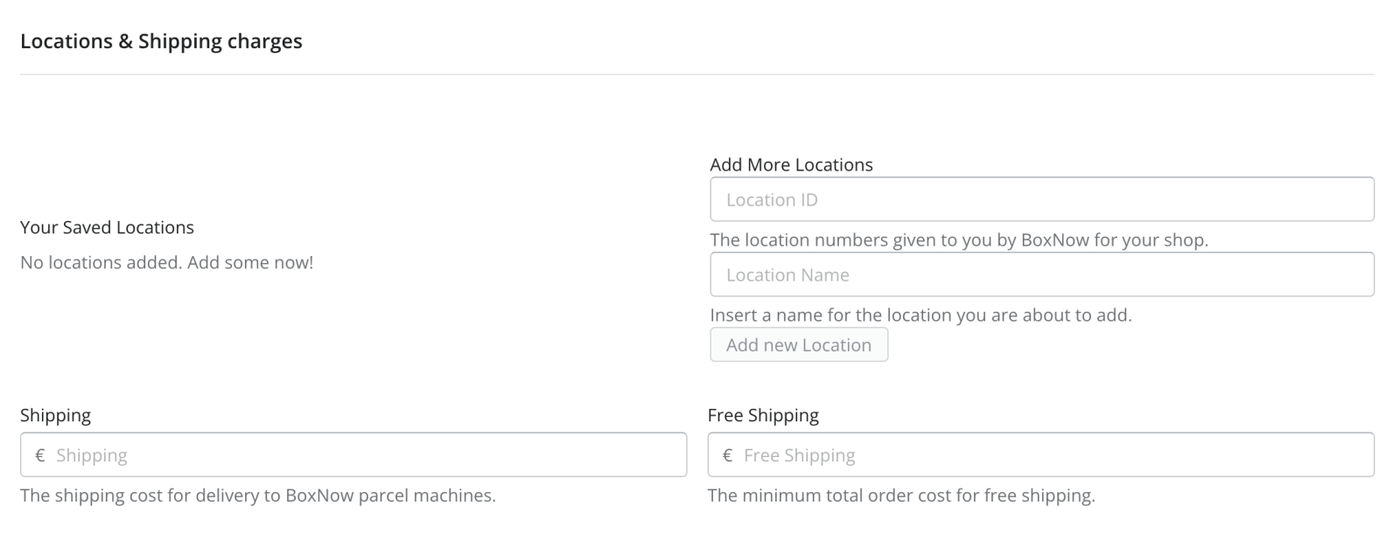 Τα credentials συμπληρώνονται στα αντίστοιχα πεδία. Όσον αφορά το warehouse id, έχει να κάνει με την προσθήκη ενός location, με id αυτό που έχει δοθεί από την Box Now και name ένα οποιοδήποτε λεκτικό.